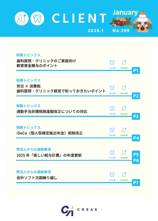 医療情報誌「CLIENT」1月号を発行いたしました 2026.01.05 日本クレアス税理士法人発行の医療情報誌「CLIENT」1月号を発行いたしました。 ※PDFの閲覧はパスワードが必要です。弊法人より発送のCLIENT本誌掲載のパスワードをご確認ください。 お知らせ一覧へ