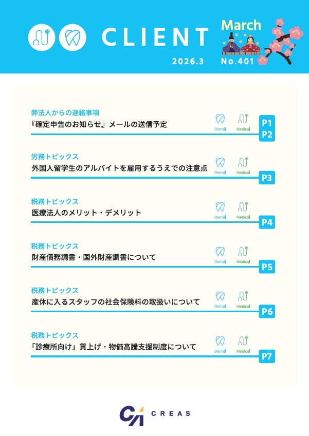 医療情報誌「CLIENT」3月号を発行いたしました 2026.03.02 日本クレアス税理士法人発行の医療情報誌「CLIENT」3月号を発行いたしました。 ※PDFの閲覧はパスワードが必要です。弊法人より発送のCLIENT本誌掲載のパスワードをご確認ください。 お知らせ一覧へ