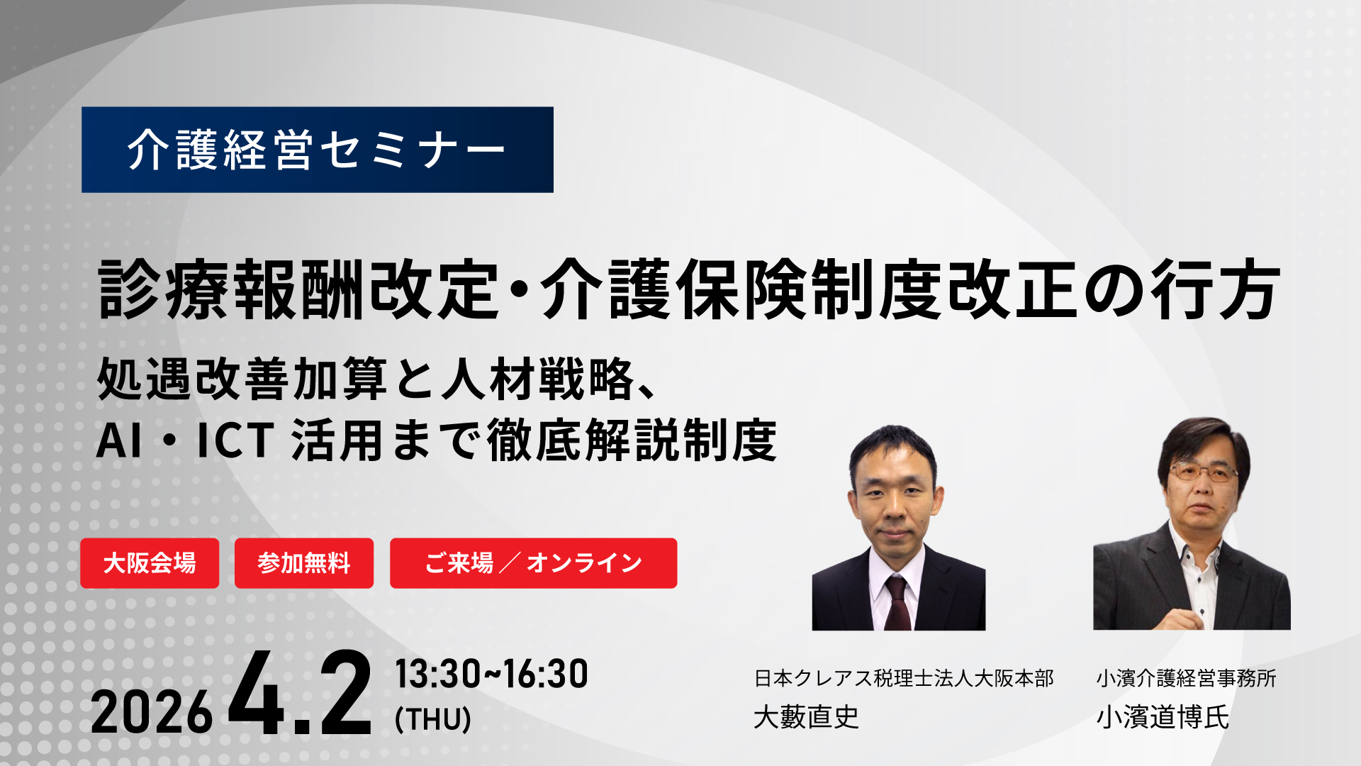 大きく変わり続ける制度改定の流れを正しく理解し、これからの介護経営を考えるために、経営者・管理者・職員の皆さまにぜひお聞きいただきたい講座です。
